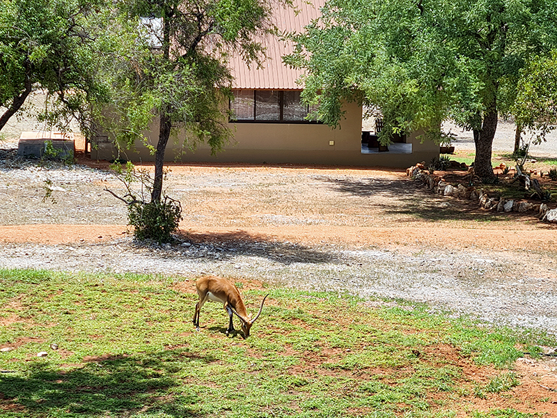 The Pool Terrace: Unwind by our sparkling swimming pool with a sundowner in hand, while antelope roam and graze peacefully at the edge of the lodge area.